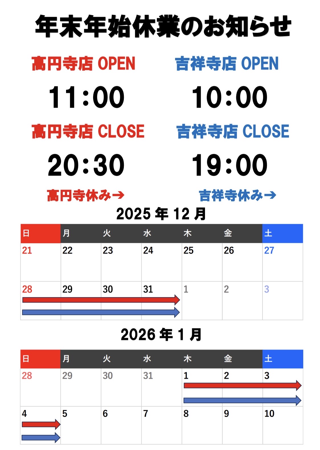 2026年は1月5日の月曜日から高円寺・吉祥寺ともに通常通り営業いたします。